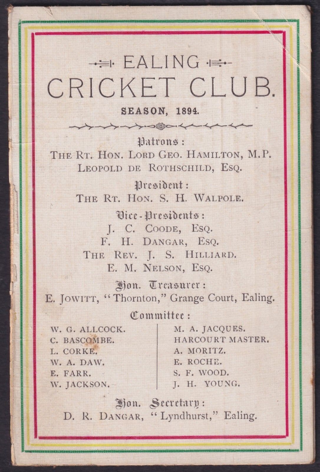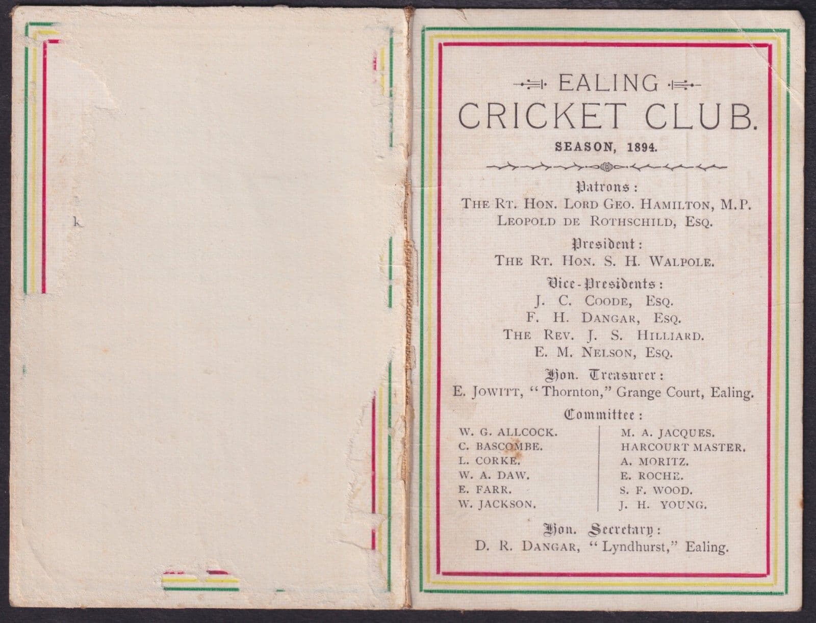 1894 Ealing Cricket Club Fixtured Folded Card; back surface removed; annotated
