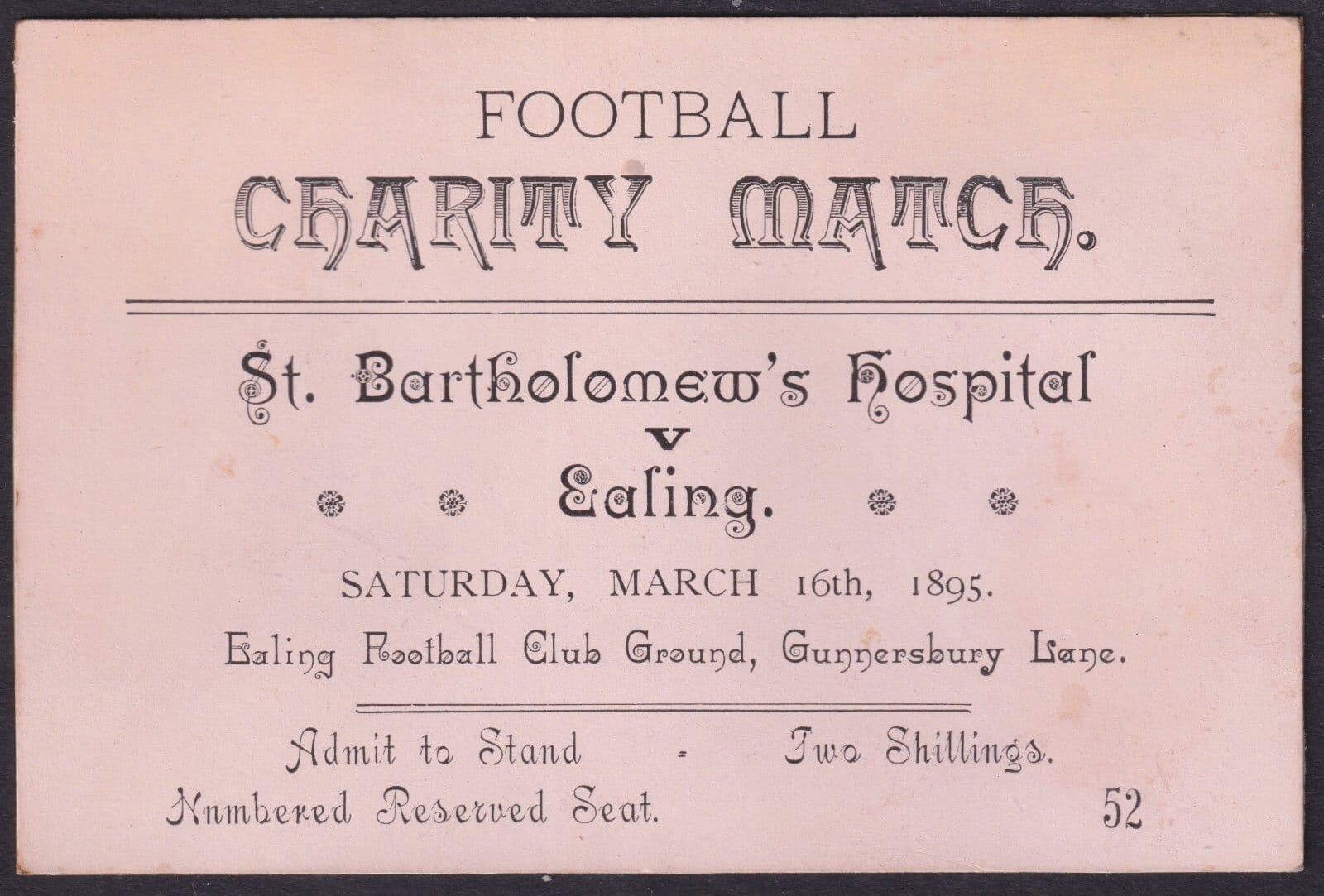 1895 St. Bartholomew's Hospital v Ealing Football Charity Match; Seat #52 Ticket