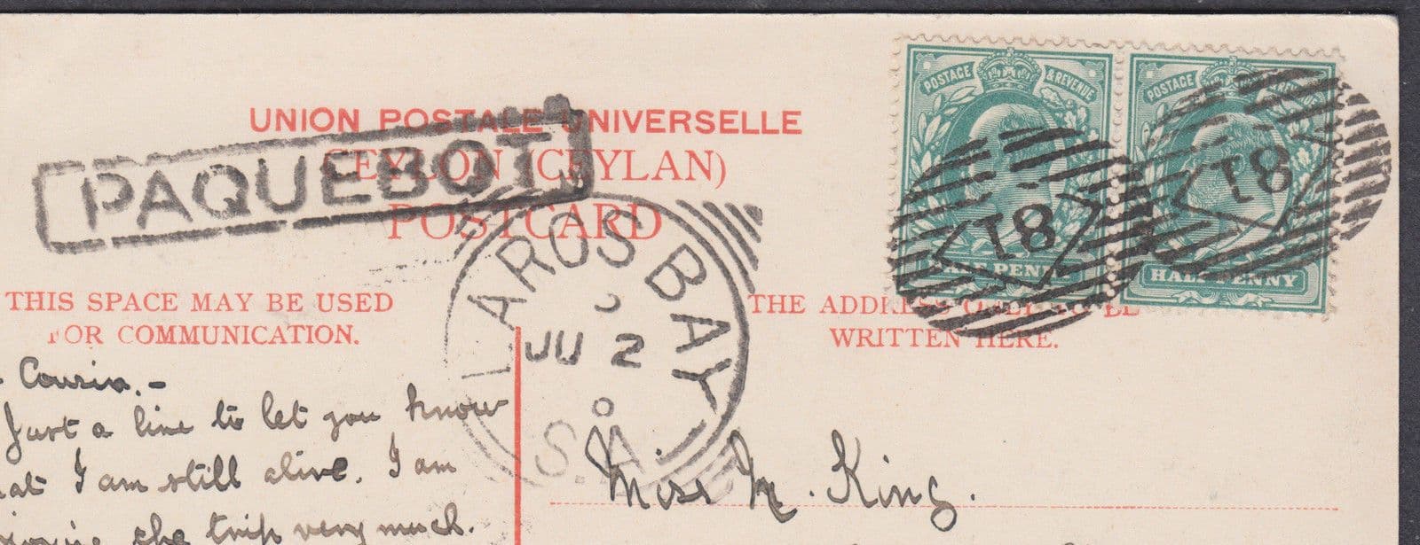 1902?KEVII GB Used Abroad,South Australia Numeral;Largs Bay/Paqubot:UK;Ceylon PC