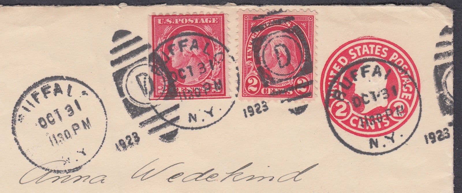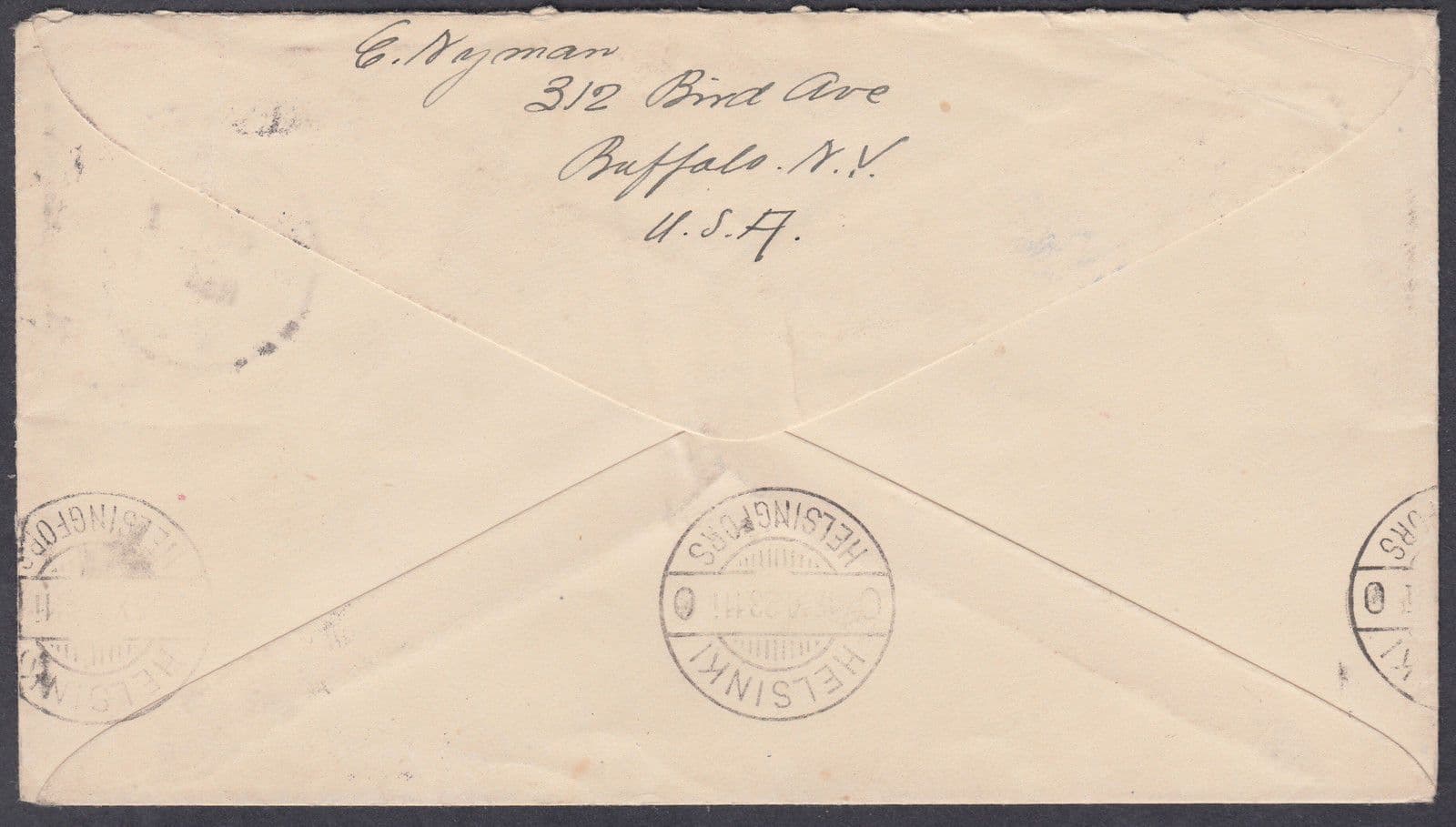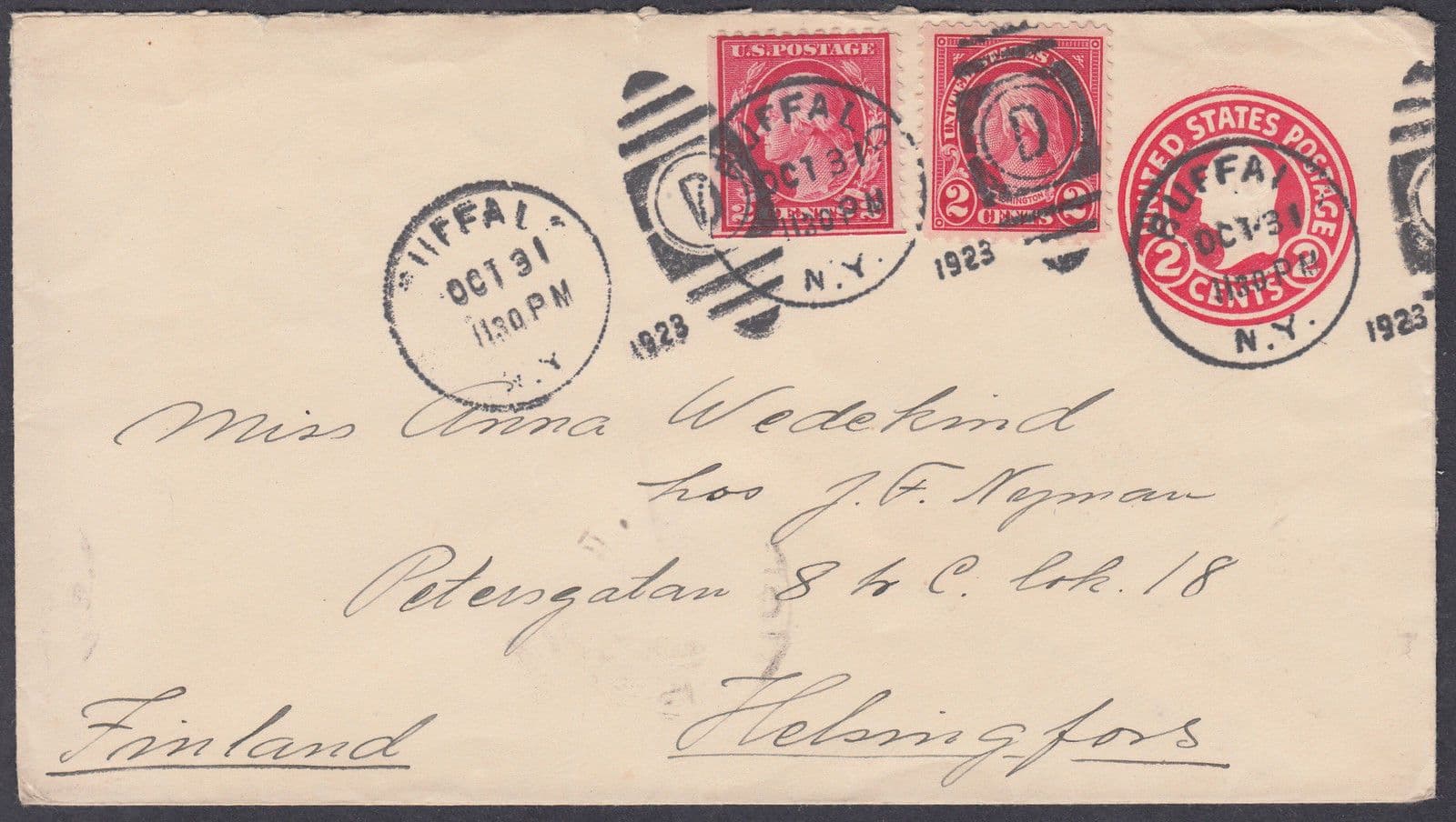 1923 USA Baffalo NY uprated Stationery Envelope to Helsinki (backstamp), Finland