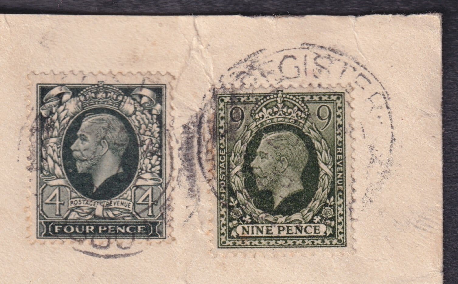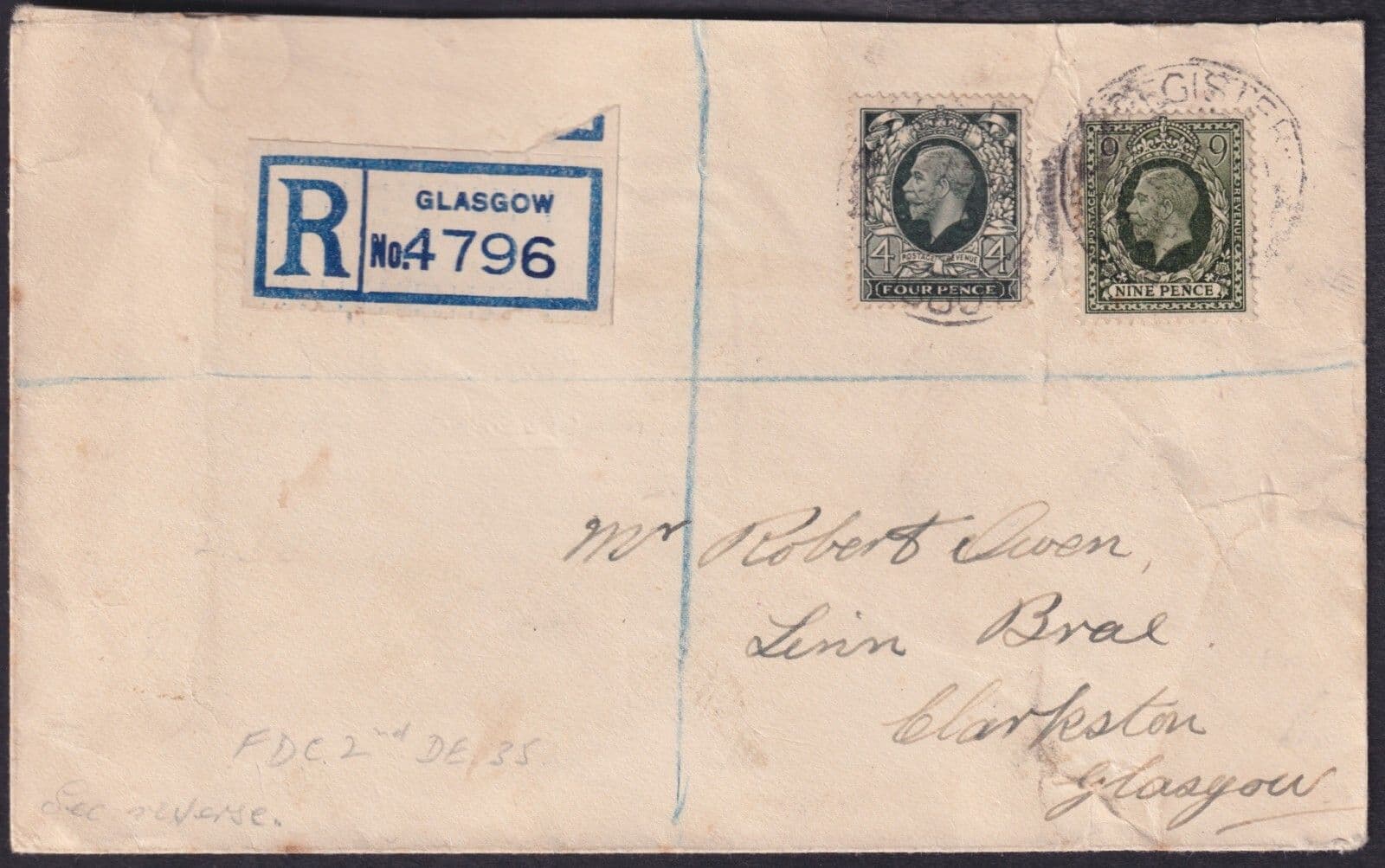 1935 KGV Definitives 4d grey-green + 9d olive-green FDC; indistinct Glasgow CDS