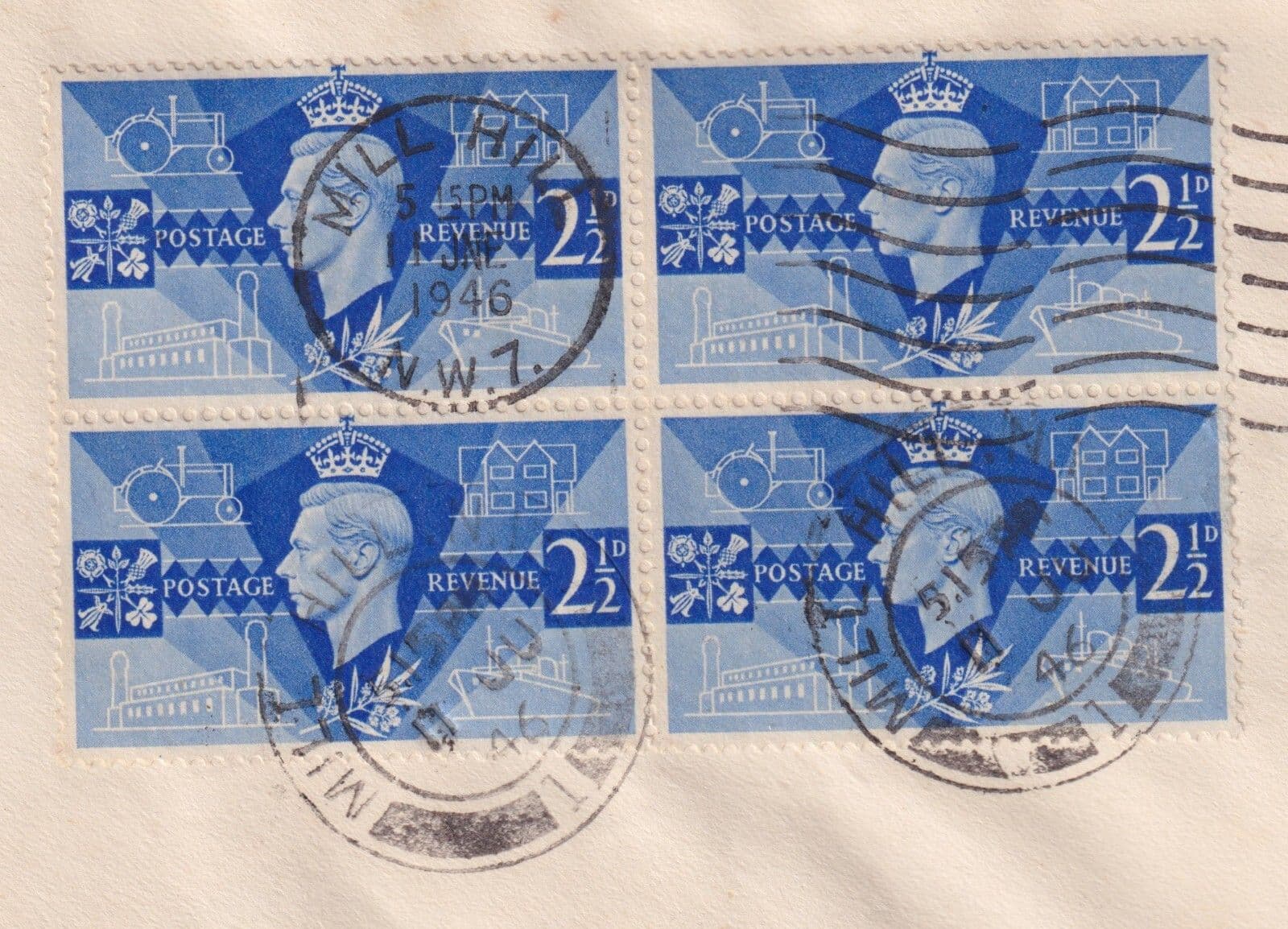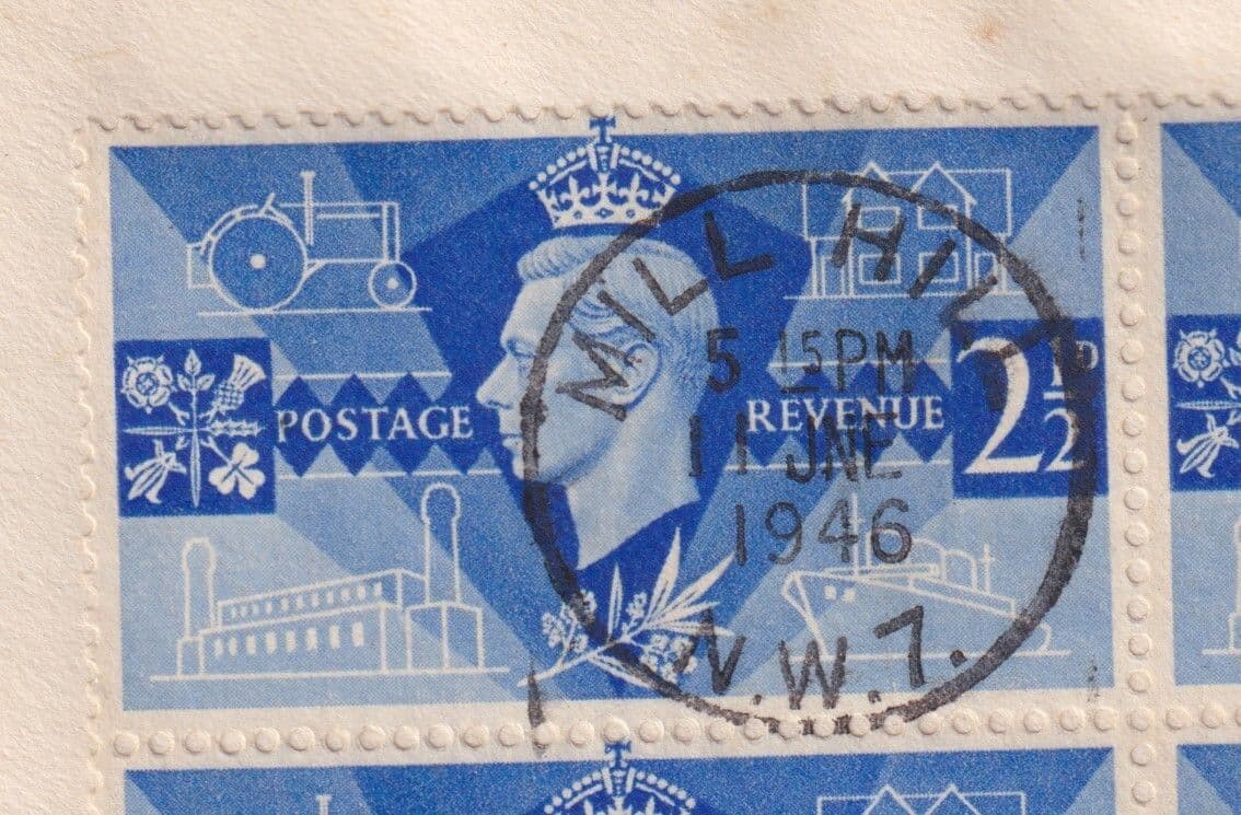 1946 Victory 2 1/2d blue Block scarce design FDC; Mill Hill/W7 M/C+ CDS