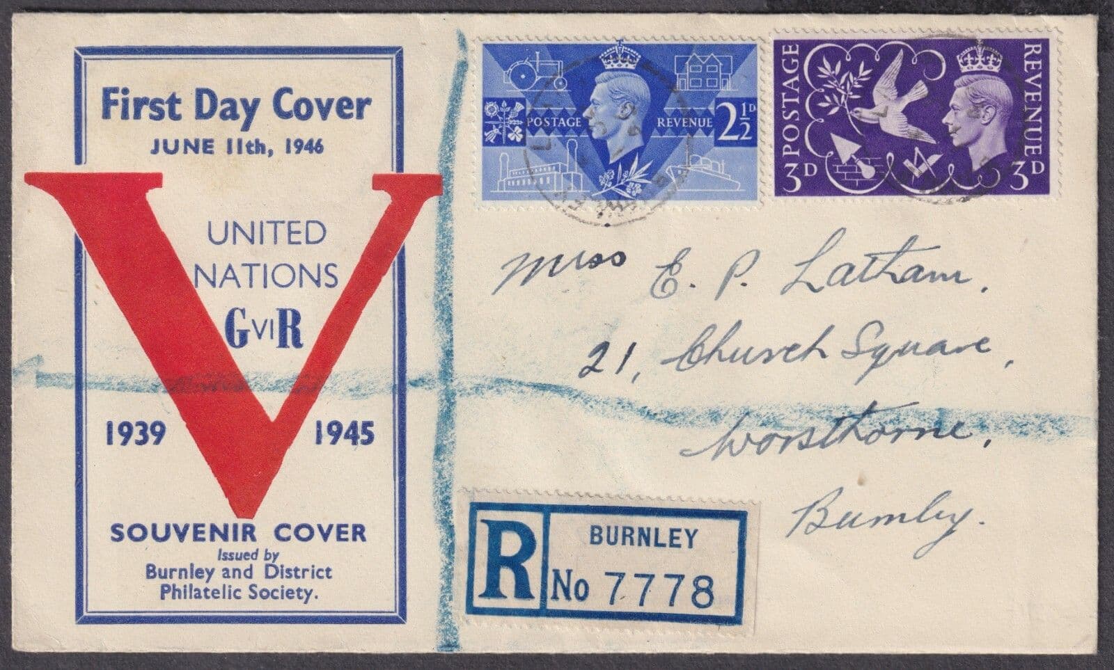 1946 Victory scarce Burnley & District Philatelic Society FDC; Burnley/Lancs CDS