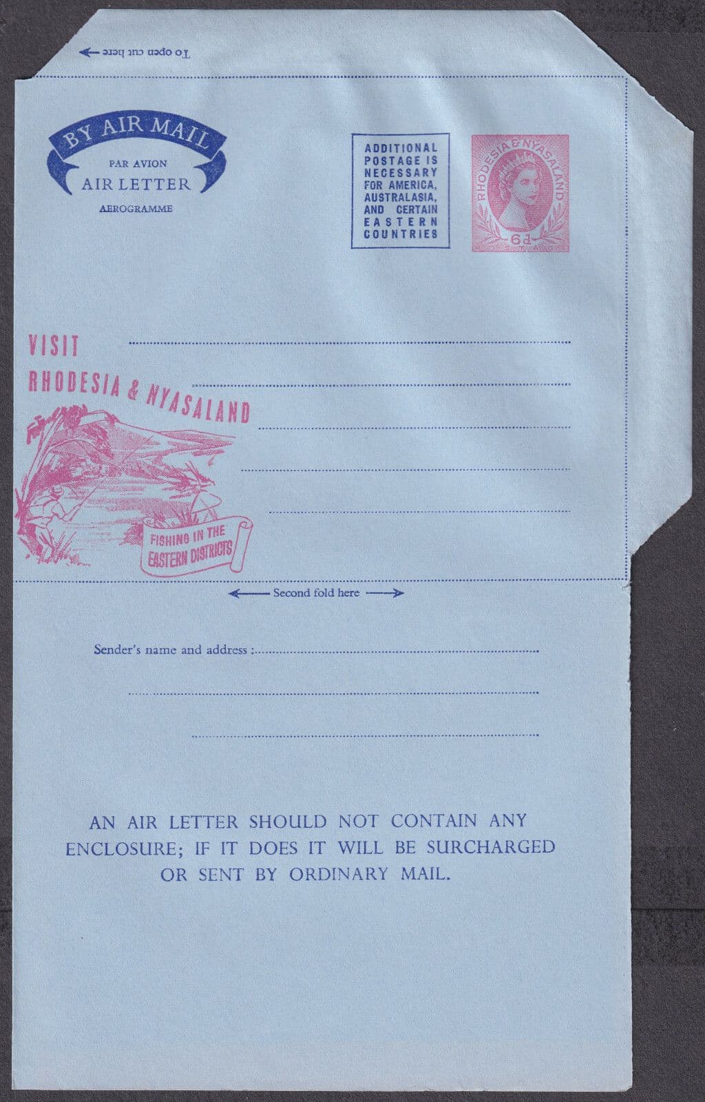 Rhodesia & Nyasaland QEII 6d Air Letter/Aerogramme;Fishing Eastern Dist'; Mint