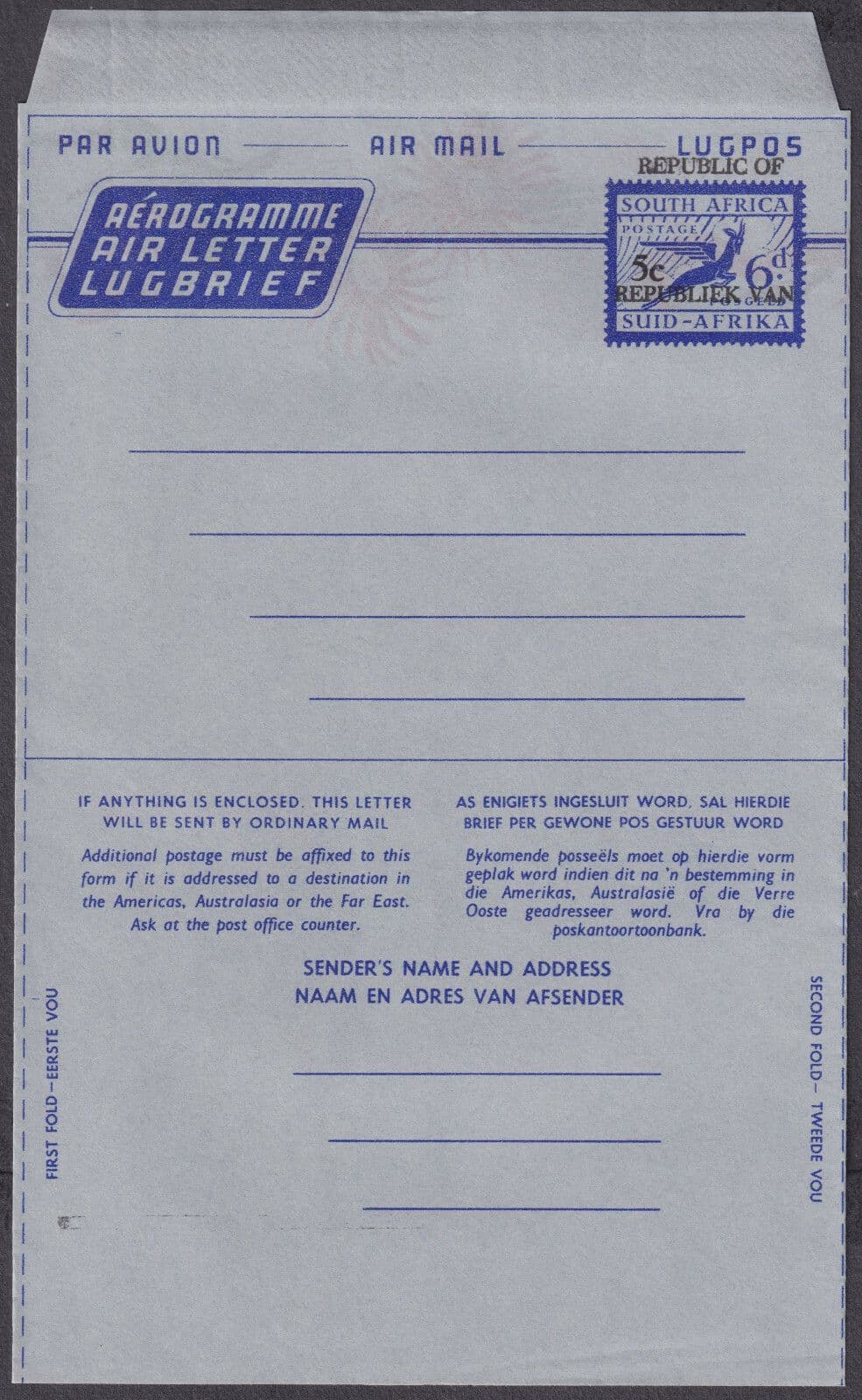 South Africa '5c / Republic of' overprint on 6d Air Letter / Aerogramme; Mint